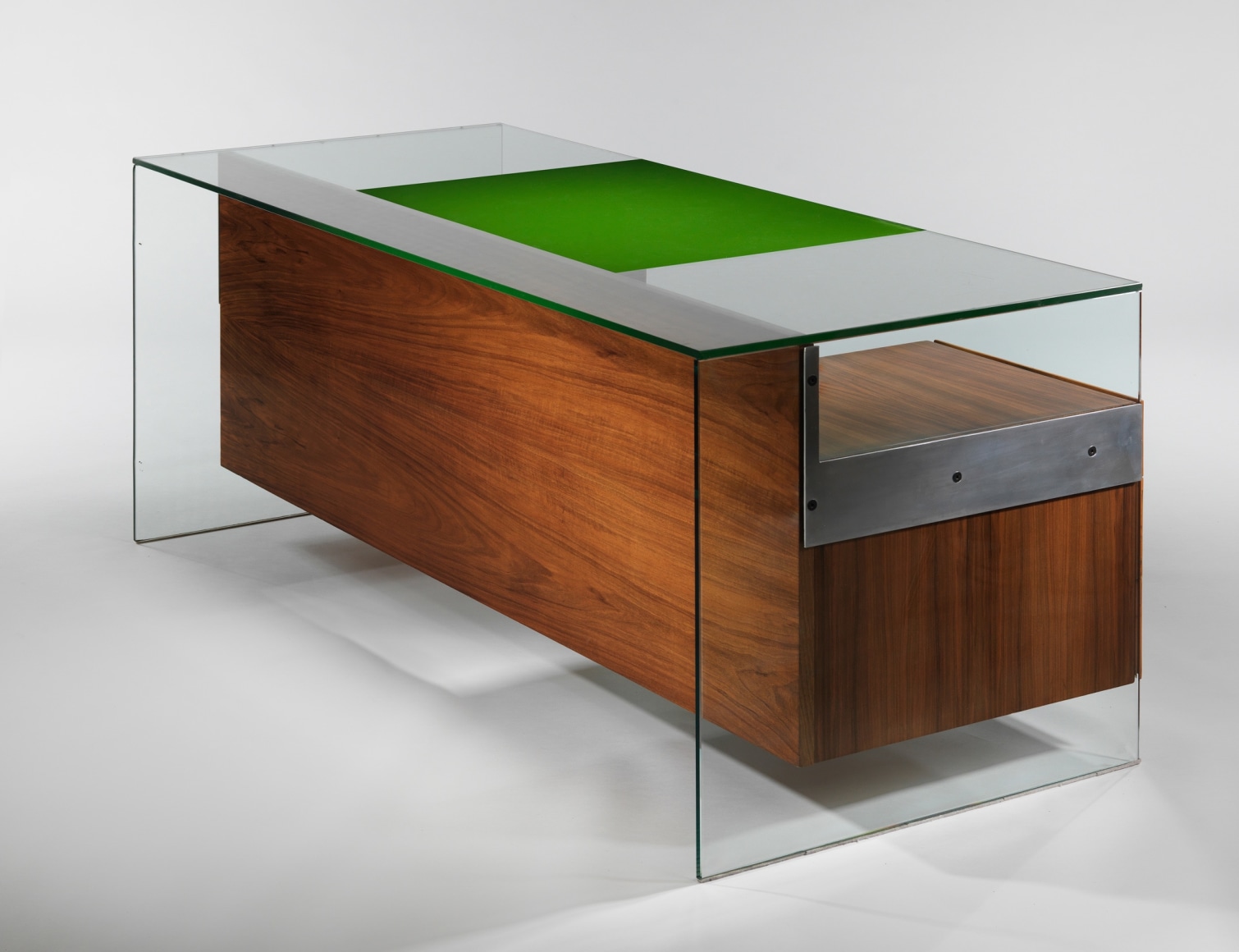 Walnut, tempered glass, aluminum